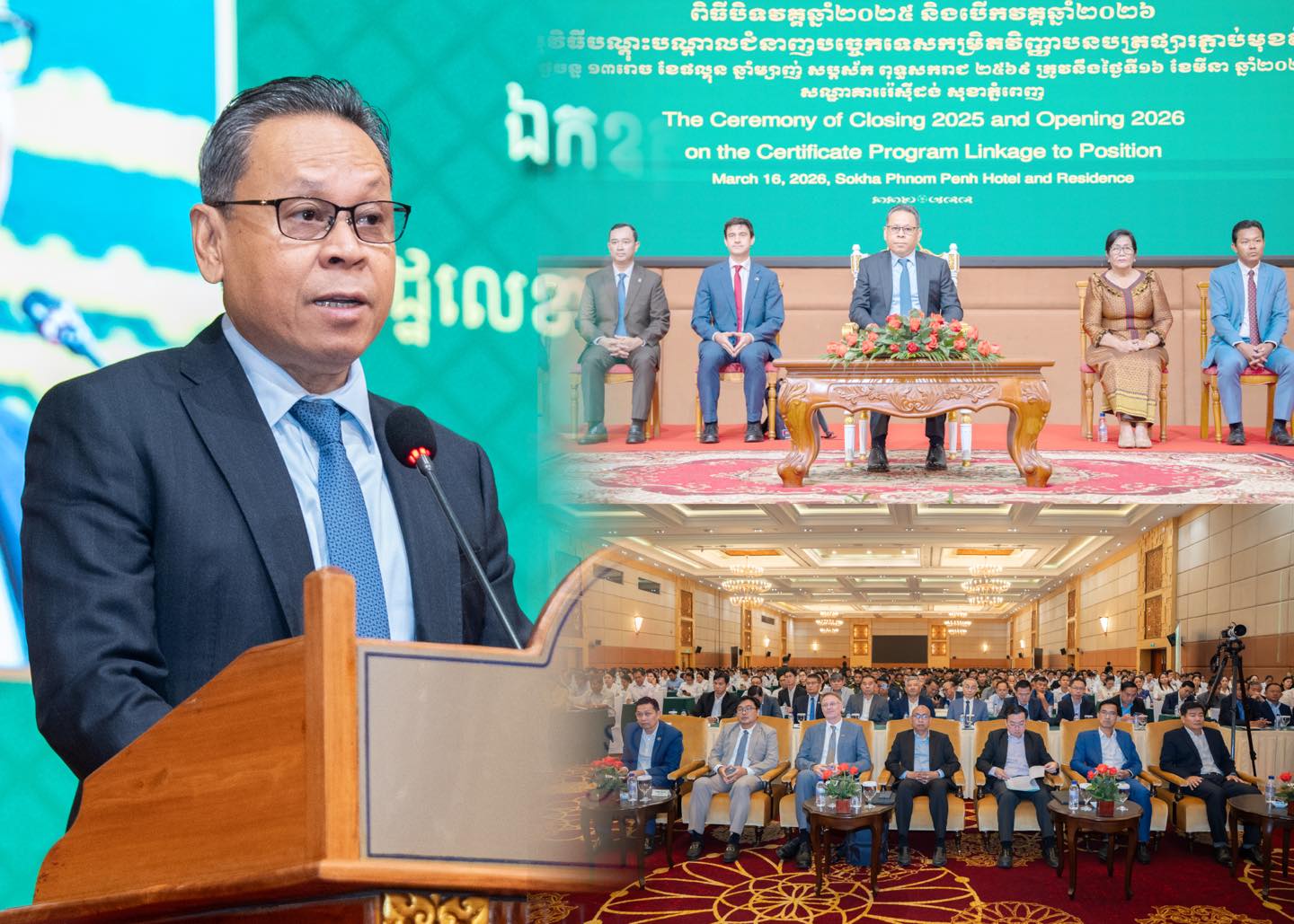 នាព្រឹកថ្ងៃទី ១៦ ខែ មីនា ឆ្នាំ ២០២៦ នៅសណ្ឋាគាររ៉េស៊ីដង់សុខាភ្នំពេញ, ក្រសួងសេដ្ឋកិច្ច និងហិរញ្ញវត្ថុ បានរៀបចំពិធីបិទវគ្គសិក្សាឆ្នាំ ២០២៥ និង បើកវគ្គសិក្សាឆ្នាំ ២០២៦ នៃ «កម្មវិធីបណ្ដុះបណ្ដាលកម្រិតវិញ្ញាបនបត្រផ្សារភ្ជាប់មុខតំណែង ដោយមានការចូលរួមពីសិក្ខាកាមជ័យលាភីឆ្នាំ ២០២៥ និង សិក្ខាកាមគោលដៅឆ្នាំ ២០២៦ ជាមន្រ្តីអនុវត្តការងារហិរញ្ញវត្ថុសាធារណៈ មកពីក្រសួងស្ថាប័ន រួមទាំងមន្ទីរជំនាញ, គ្រឹះស្ថានសាធារណៈរដ្ឋបាល និង រដ្ឋបាលរាជធានី-ខេត្តទាំង ២៥ ។