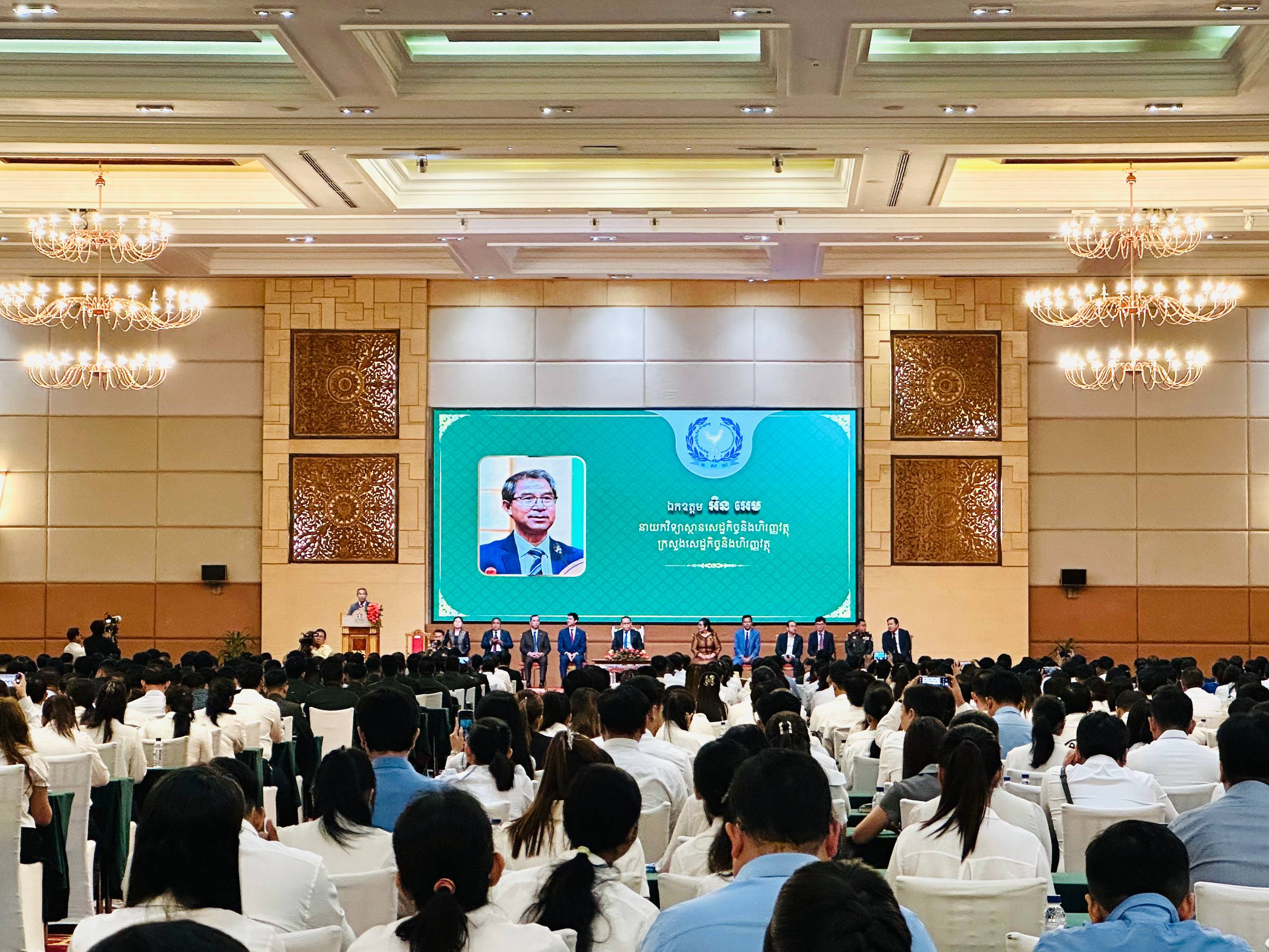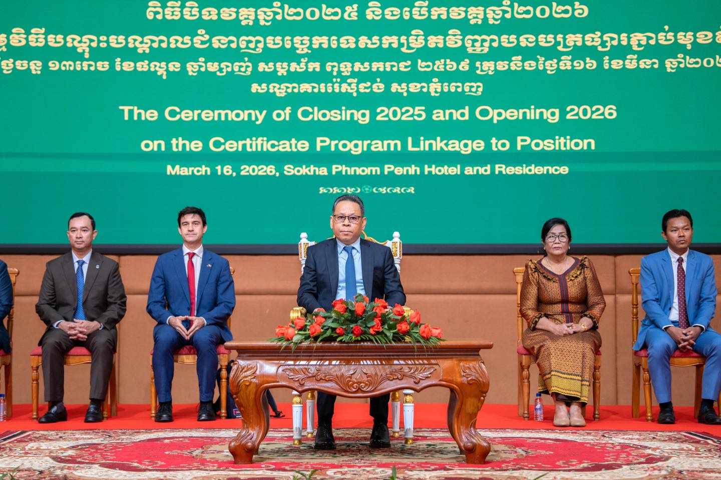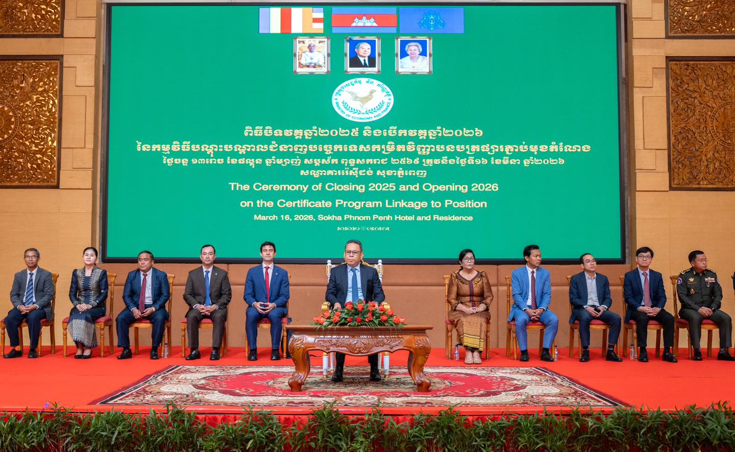 នាព្រឹកថ្ងៃទី ១៦ ខែ មីនា ឆ្នាំ ២០២៦ នៅសណ្ឋាគាររ៉េស៊ីដង់សុខាភ្នំពេញ, ក្រសួងសេដ្ឋកិច្ច និងហិរញ្ញវត្ថុ បានរៀបចំពិធីបិទវគ្គសិក្សាឆ្នាំ ២០២៥ និង បើកវគ្គសិក្សាឆ្នាំ ២០២៦ នៃ «កម្មវិធីបណ្ដុះបណ្ដាលកម្រិតវិញ្ញាបនបត្រផ្សារភ្ជាប់មុខតំណែង ដោយមានការចូលរួមពីសិក្ខាកាមជ័យលាភីឆ្នាំ ២០២៥ និង សិក្ខាកាមគោលដៅឆ្នាំ ២០២៦ ជាមន្រ្តីអនុវត្តការងារហិរញ្ញវត្ថុសាធារណៈ មកពីក្រសួងស្ថាប័ន រួមទាំងមន្ទីរជំនាញ, គ្រឹះស្ថានសាធារណៈរដ្ឋបាល និង រដ្ឋបាលរាជធានី-ខេត្តទាំង ២៥ ។