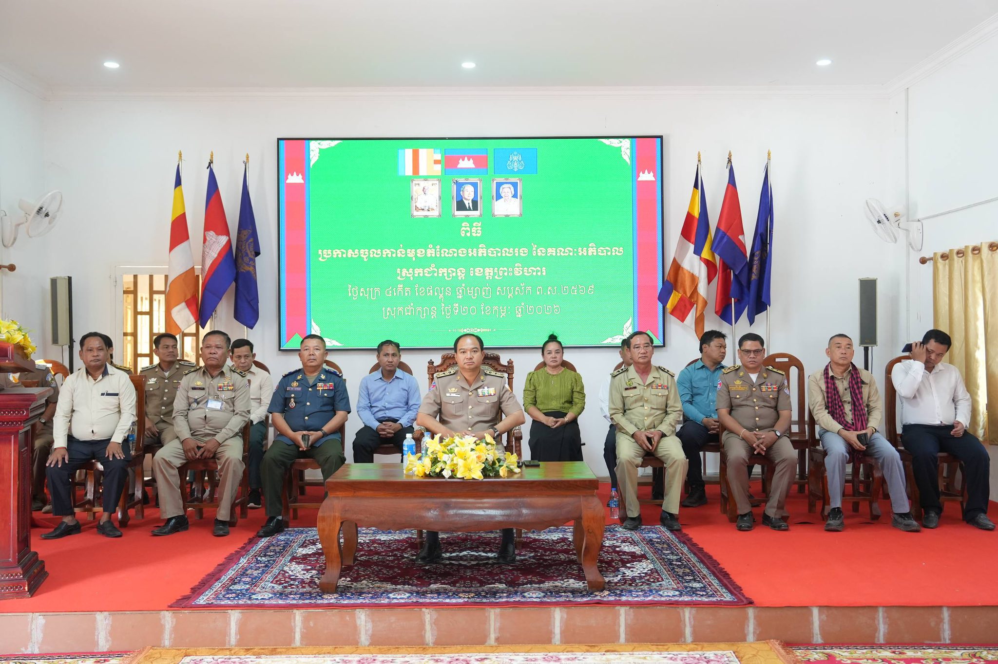 ថ្ងៃសុក្រ ៤កើត ខែផល្គុន ឆ្នាំម្សាញ់ សប្តស័ក ពុទ្ធសករាជ ២៥៦៩ ត្រូវនឹងថ្ងៃទី២០ ខែកុម្ភៈ ឆ្នាំ២០២៦, លោក ម៉ុម សុទ្ធារ៉ា ប្រធានមន្ទីរសេដ្ឋកិច្ចនិងហិរញ្ញវត្ថុខេត្តព្រះវិហារ បានចូលរួមពិធីប្រកាសតែងតាំង លោក ថោង គឹមថេង ជាអភិបាលរងស្រុកជាំក្សាន្ត ក្រោមអធិបតីភាព ឯកឧត្តម គីម រិទ្ធី អភិបាលខេត្តព្រះវិហារ នៅសាលប្រជុំសាលាស្រុកជាំក្សាន្ត។