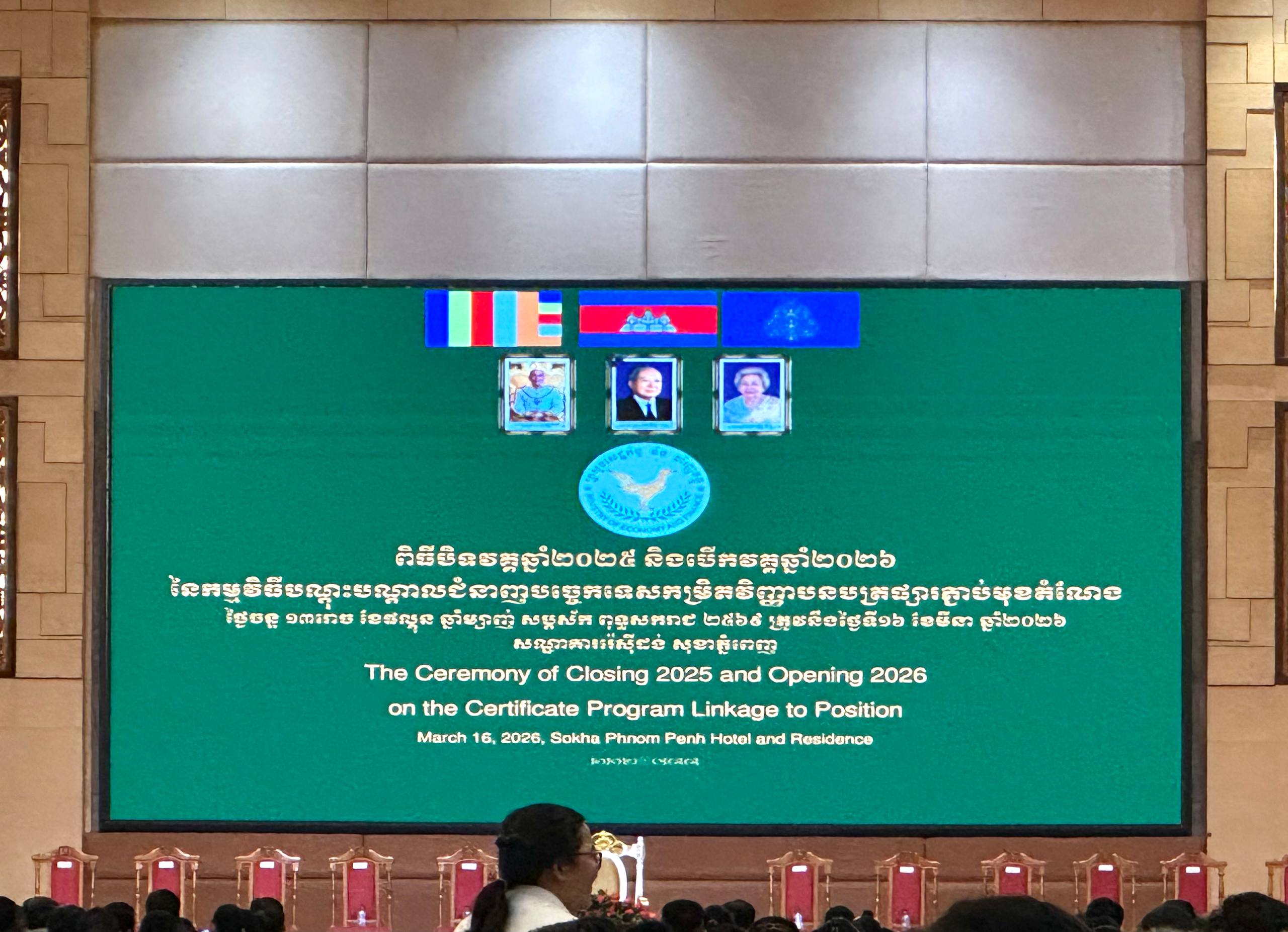 នាព្រឹកថ្ងៃទី ១៦ ខែ មីនា ឆ្នាំ ២០២៦ នៅសណ្ឋាគាររ៉េស៊ីដង់សុខាភ្នំពេញ, ក្រសួងសេដ្ឋកិច្ច និងហិរញ្ញវត្ថុ បានរៀបចំពិធីបិទវគ្គសិក្សាឆ្នាំ ២០២៥ និង បើកវគ្គសិក្សាឆ្នាំ ២០២៦ នៃ «កម្មវិធីបណ្ដុះបណ្ដាលកម្រិតវិញ្ញាបនបត្រផ្សារភ្ជាប់មុខតំណែង ដោយមានការចូលរួមពីសិក្ខាកាមជ័យលាភីឆ្នាំ ២០២៥ និង សិក្ខាកាមគោលដៅឆ្នាំ ២០២៦ ជាមន្រ្តីអនុវត្តការងារហិរញ្ញវត្ថុសាធារណៈ មកពីក្រសួងស្ថាប័ន រួមទាំងមន្ទីរជំនាញ, គ្រឹះស្ថានសាធារណៈរដ្ឋបាល និង រដ្ឋបាលរាជធានី-ខេត្តទាំង ២៥ ។