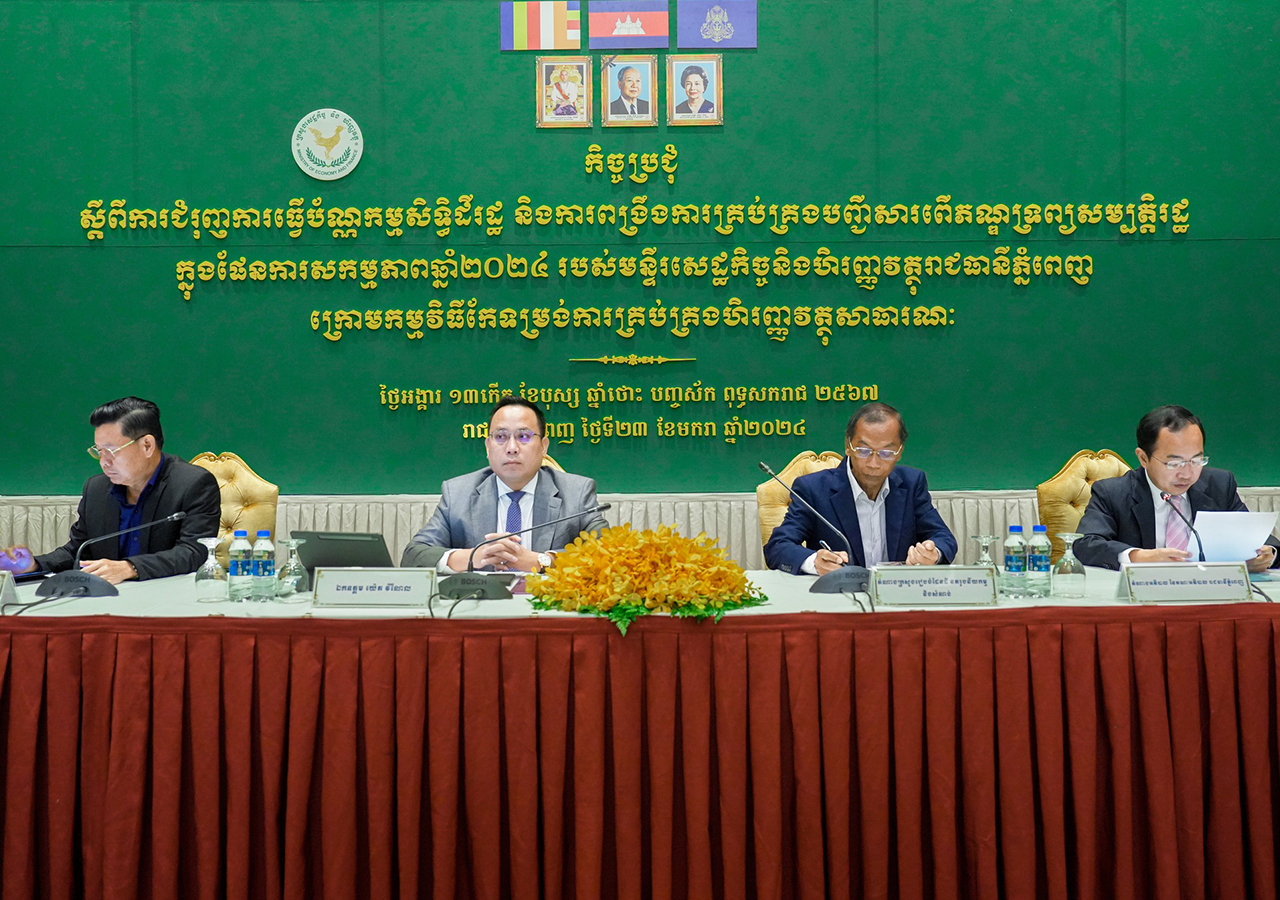 កិច្ចប្រជុំ “ការជំរុញការធ្វើប័ណ្ណកម្មសិទ្ធិដីរដ្ឋ និងការពង្រឹងការគ្រប់គ្រងបញ្ជីសារពើភណ្ឌទ្រព្យសម្បត្តិរដ្ឋ ក្នុងផែនការសកម្មភាពឆ្នាំ២០២៤ របស់មន្ទីរសេដ្ឋកិច្ចនិងហិរញ្ញវត្ថុរាជធានីភ្នំពេញ ក្រោមកម្មវិធីកែទម្រង់ការគ្រប់គ្រងហិរញ្ញវត្ថុសាធារណៈ”