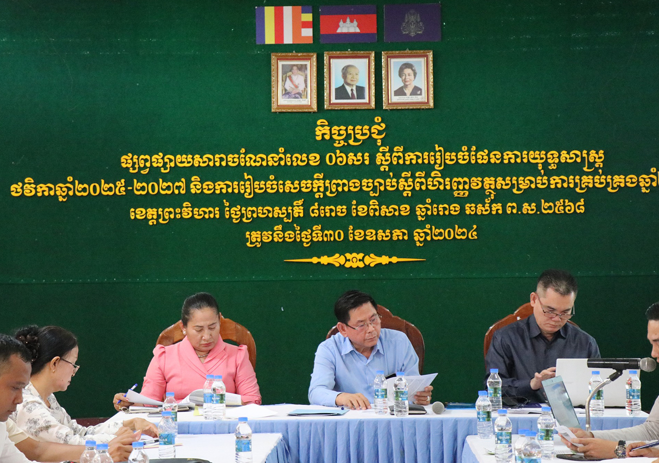 នាថ្ងៃព្រហស្បតិ៏ ៨រោច ខែពិសាខ ឆ្នាំរោង ឆស័ក ព.ស.២៥៦៨ ត្រូវនឹងថ្ងៃទី៣០ ខែឧសភា ឆ្នាំ២០២៤ មន្ទីរសេដ្ឋកិច្ច និងហិរញ្ញវត្ថុខេត្តបានរៀបចំកិច្ចប្រជុំផ្សព្វផ្សាយសារាចរលេខ០៦ សរ របស់រាជរដ្ឋាភិបាលកម្ពុជា ចុះថ្ងៃទី១៣ ខែឧសភា ឆ្នាំ២០២៤ ស្តីពីការរៀបចំផែនការយុទ្ធសាស្រ្តថវិកាឆ្នាំ ២០២៥-២០២៧ និងការរៀបចំសេចក្តីព្រាងច្បាប់ស្តីពីហិរញ្ញវត្ថុ សម្រាប់ការគ្រប់គ្រង់ឆ្នាំ២០២៥
